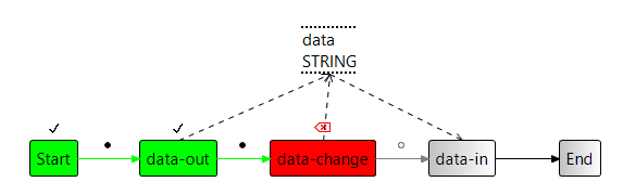 A suspended instance can be modeled in the Editor like a normal process template. For example, another step change-data that changes the data element data can be inserted into the basic modeled template as follows. After saving the modifications when closing the view, the instance can be resumed in the Test Client.