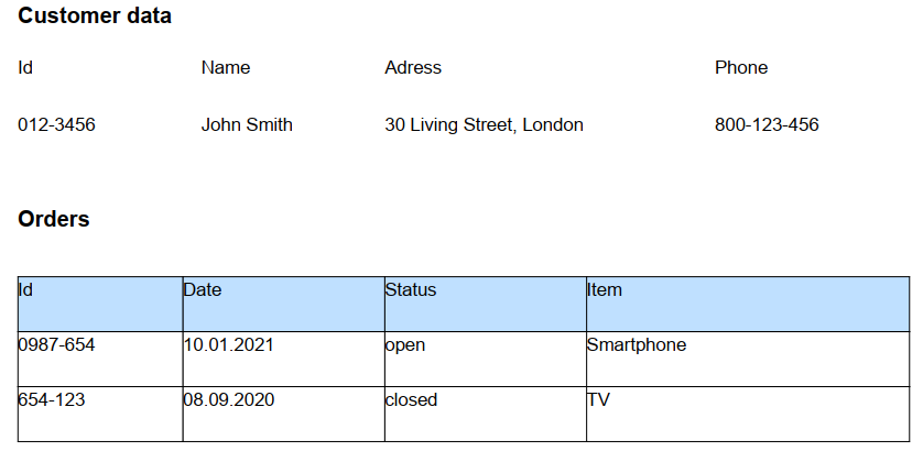In this example we pass a Json-File as parameter from BPM-process to the report and display the content of the file in a table. The Json-File contents data about Customer and their orders. Due to the list-like structure of the order data, we can only display them in a table.