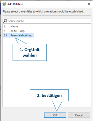 Mit folgenden Bildern wird geschildert, wie eine Stelle (OrgPosition) zu einer Abteilung (OrgUnit) zugeordnet wird.