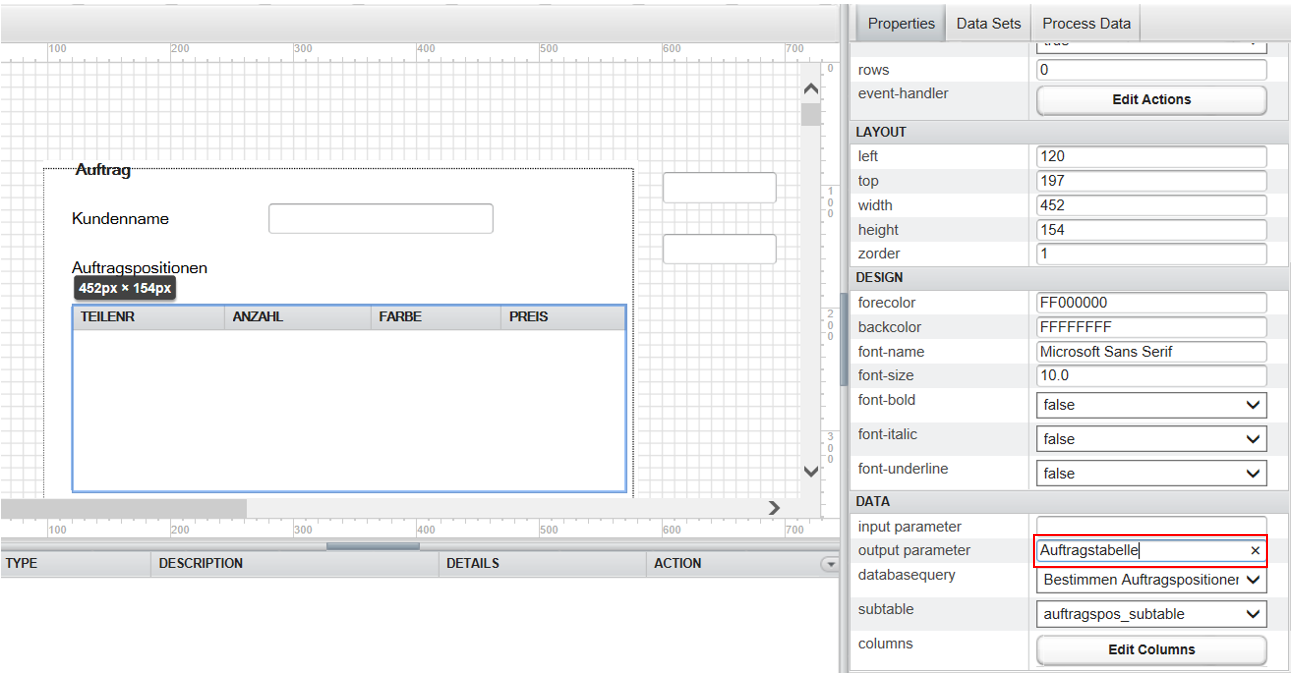 Die Ergebnisspalten aus der Datenbankabfrage Bestimmen Auftragspositionen werden den Spalten in der Subtabelle zugewiesen. Lässt man in der Properties-Ansicht das Feld Databasecolumn der Spalte leer, dann wird die erste Ergebnisspalte darauf gemappt.