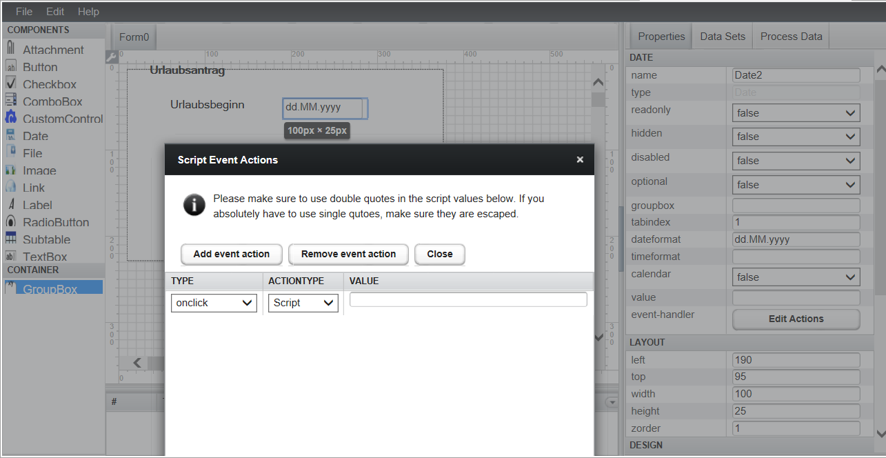 Die Überprüfung, ob der Urlaubsbeginn vor dem morgigen Datum liegt, soll bei jeder Änderung des ersten Feldes stattfinden. Daher wählen sie als Eventstyp onchange und lassen Actiontype auf Script.