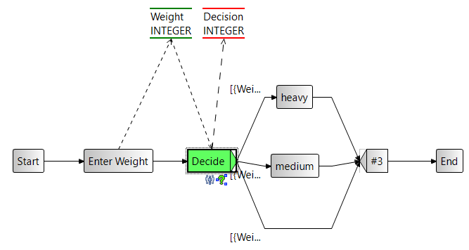 Our XOR activity has one input parameter and must be able to choose between three alternative paths. It is executed by automatic client (see the staff assignment rule in the next image). The following wizard page opens direct after inserting the XOR activity and is used to configure the activity. To do this, assign the SAR by clicking the corresponding arrow and then go to the next page. On the next page, the XOR decision parameter is displayed as input and output parameter. We don't need change anything and go to the next page Dimensions. This determines which variable the decision is based on. By double-clicking on the Weight variable, it is inserted into the dimension field. In the drop-down box, for this example, let's leave it at the default Constants. Now for each dimension (in this case only one) predicates must be defined. The opening dialog (see next image) with error shows us that the entire input value range is not yet covered. To form the predicates we can use the usual comparison operators (<, ≤, =, ≥, …) and use integer constants as limit values. We specify the predicates as at the beginning given in the example and obtained as a result the next image in which all intervals are covered. On the page Desicion Labels, the predicates are assigned to decision Labels. A decision label can be freely named or have the same name as the predicate(Add Auto). To do this, click Add Auto for each predicate. You can also assign multiple predicates to the same label, then these predicates become a group and linked with XOR. The decision identifier is also used later to appropriately label the edges of the XOR branch. On the next page, you can see a summary of the decision labels and decision statements. In the last step, you can assign the decision identifiers to the edges whereby several identifiers can also assigned to an edge. As with the groups, this then corresponds to an XOR connection of the predicates. We assign here each decision label to its own edge. To do this, use the arrow between the label and edge fields as in the next image.
